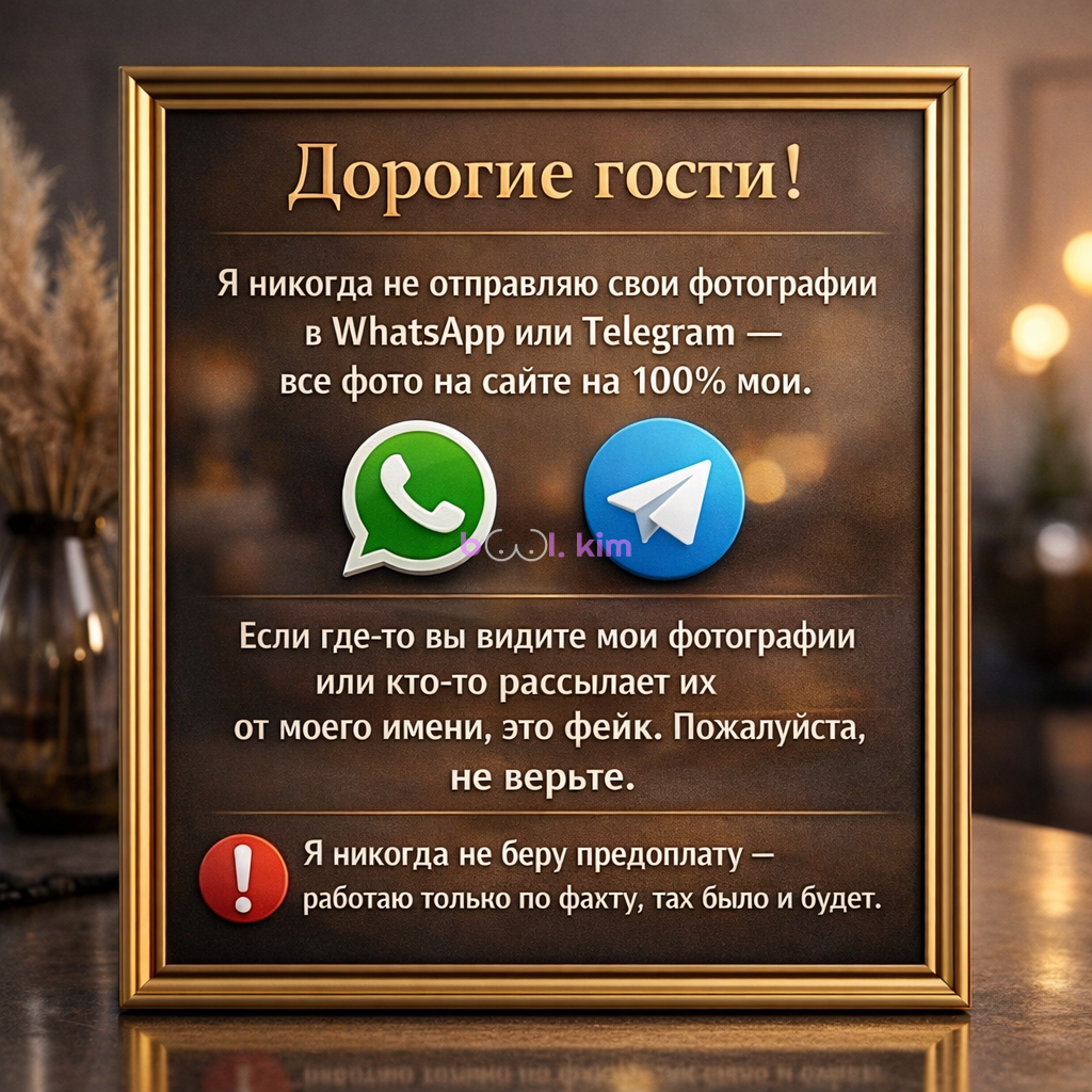 Для меня важны комфорт, качество и приятная обстановка. Вы платите не только за секс но и за атмосферу, внимание и наш общий приятный вечер.